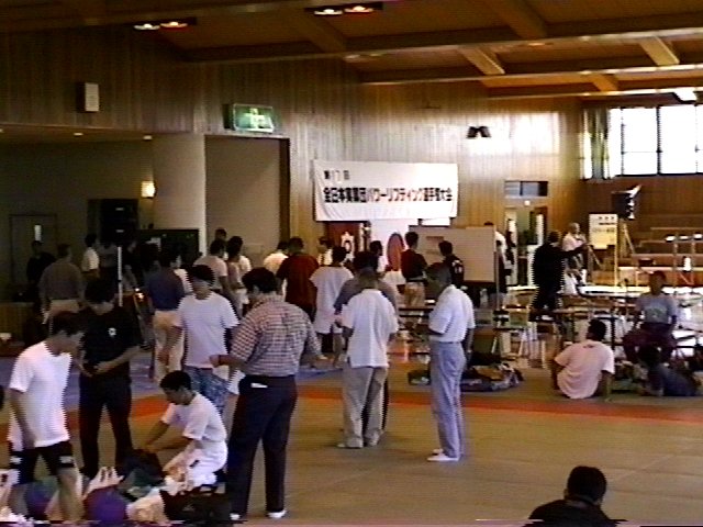私はレンタカーを借りて、夜中にドライブして真岡市に向かいました。8:30から受付と検量が始まりました。出場者は60名くらいということで、会場は検量に向かう人、受付の用紙に必要項目を記入する人、ラックの高さを調べる人、コスチュームチェックを受ける人などで混み合っていました。
