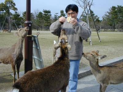 そして奈良公園といえば鹿ですね。まるでサファリパークのように放し飼いされていました。芝生の上には丸く黒いフンが所狭しと落ちており、とても腰を降ろせそうにないところにはびっくりしました。鹿せんべいを購入し、鹿にあげようとしたのですが、寄ってきて体あたりされるはと、少し恐怖を感じてしまいました(^_^;。