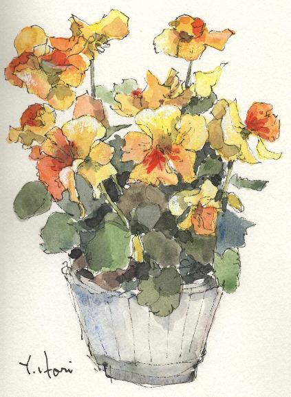 風景や建物ばかりなので花のスケッチを載せました。パンジーとビオラは同じ種で、2〜4センチくらいのものをビオラというそうです。花言葉は「わたしを思ってください」だそうです。