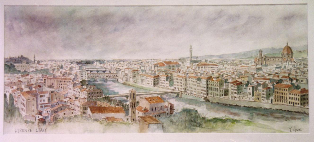 フィレンチェのミケランジェロ広場からの眺望。アルノ川とベッキオ橋。ジヨットの鐘楼と花の聖母教会サンタマリア・デル・フィオーレの大聖堂。数年前のイタリヤ旅行で一番絵心がわいた景色です。一般のツアーなので小さなスケッチしかできなかったのですが、どうしても大きな絵にしたく帰国後描きなおした絵です。