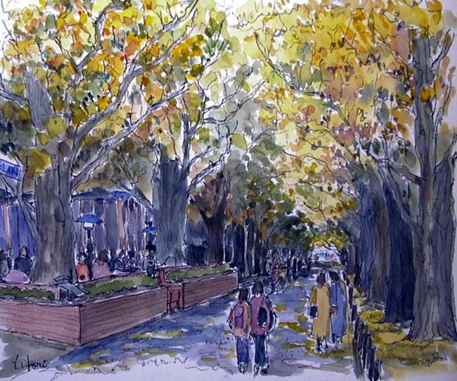 紅葉真っ盛りの時期に神宮外苑へスケッチに出かけました。秋風景に誘われた人とおまけに左手のレストランでは結婚式が行われていたため、本当はこの通りは人が一杯で見とおしが効かない状態でした。