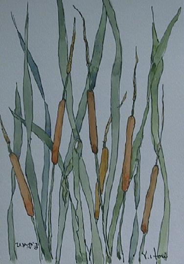 国立自然教育園はまさに自然の宝庫でしたが、緑ばかりでスケッチポイントが少ないので植物画に転じました。がまの穂は花の集合体らしく、蒲団のしんや火打ち石の火口(ほくち)に使われるそうです。.