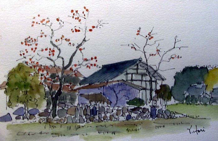 柿の実のある民家 サイズSM (22.5×16cm) Country house