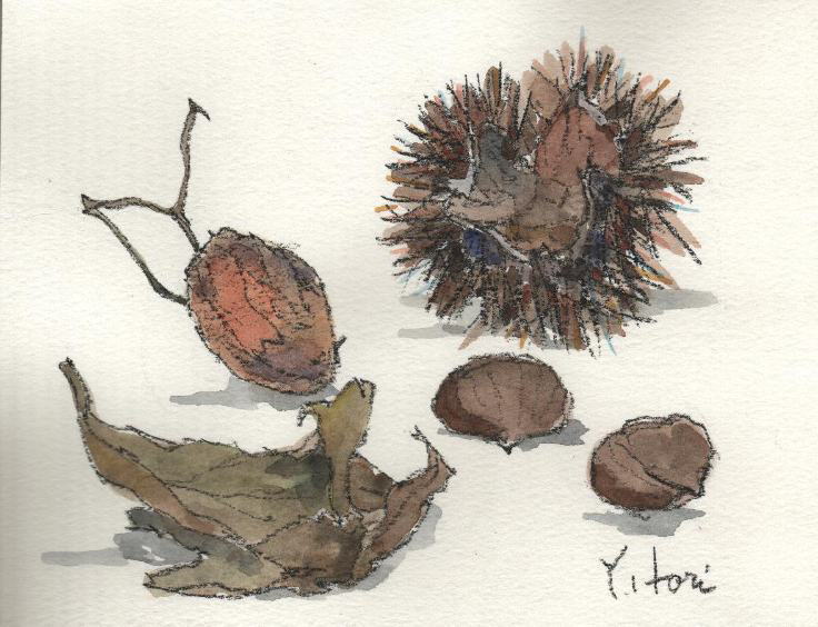 秋の名残の自然ドライフルーツをランダムに並べて描きました。からすうりはドライフルーツの盛りを過ぎてしわしわになっておりました。栗のイガを描くにはダーマトグラフは適切です。