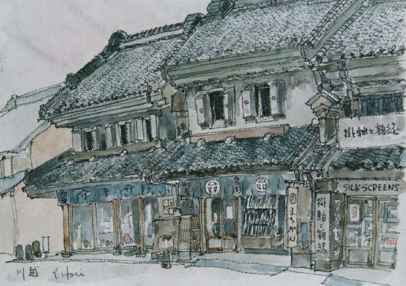 川越は近いのでよくスケッチに出かけます。荒川の河川敷や堤防沿いの道をドライブやツーリングするのも楽しいものです。川越のメインテーマは土蔵造りの家並みです。以前は工事中であった掛軸屋さんも店開きをしており、陶器のやまや、包丁の町屋、掛軸と額縁のサカゼンの三軒が並ぶと壮観です。