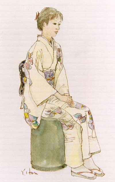人物の衣装は民族衣装が多く登場します。和服も振袖や浴衣などたびたび描きました。着物や帯の柄は様々な色合いがあり,描いて楽しいものです。