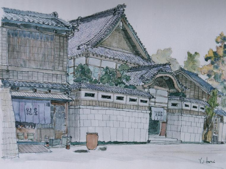 下町の風情をかもし出す家並みです。手前から安政年間に建てられた居酒屋の鍵屋、東京の銭湯を代表する昭和初期の子宝湯、同じく昭和初期の町家仕立屋です。子宝湯は神社のような入母屋造りと手の込んだ大型の唐破風、入り口の屋根には「七福神の宝船」の彫刻と贅をつくした造りです。
