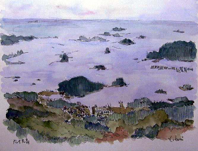 佐世保は最近ではハウステンボスで有名ですが、「西海国立公園」の九十九島のほうが老舗です。実際は170余の島が点在しています。九州の西の端なので、夕陽の景色は空と海と島々が黄金色に染まり絶景ですがとてもスケッチでは表現できません。石岳展望台からの景色で、後ろを見ると佐世保の街が見えます。