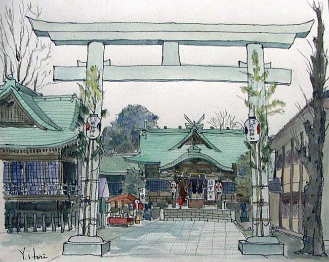 正月早々、新宿の街を描く会で西新宿に出かけました。十二社の熊野神社は、室町時代に中野長者と呼ばれた鈴木九郎が、故郷である紀州の熊野三山より十二所権現をうつし祠ったものと伝えられています。冬のスケッチは手がかじかんできます。出店のおでんと熱燗で体を温めながら描きました。