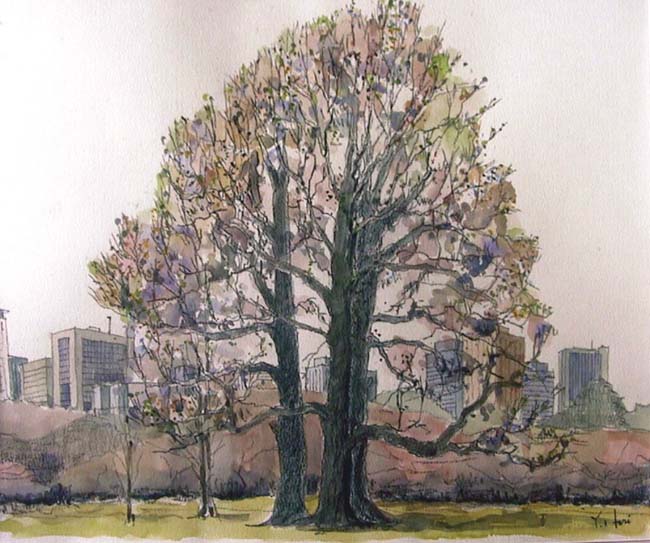 御苑にある銘木のひとつがこのユリノキです。芝生広場にあり背景の超高層ビルを従えるようにそびえています。描いたのは4月の初めで芽吹きの始まりでした。