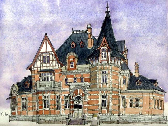 九州生まれながら門司港は初めて訪れました。門司港駅や旧門司三井倶楽部、旧門司税関などレトロ建築が残されています。やはりこの建物が一番絵心を動かされました。明治35年、中国大連市に帝政ロシアが建てたドイツ風建築物を、 北九州市・大連市友好都市締結15周年を記念して複製建築されたものらしいです。ドイツ系ハーフティンバー様式による茶と白のコントラスト、煙突やドーマ窓、 尖塔部分などが印象的な建物でした。