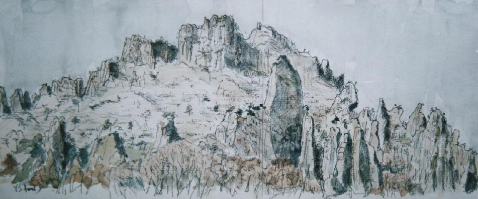 妙義山は何度か描いていますが、これは浅い春の芽吹き前の妙義山です。ごつごつした岩肌を表わすのにもダーマトグラフのタッチは最適です。妙義山に行ったときには必ず妙義町立美術館に立ち寄ります。飾られている絵はすべて妙義山の絵ばかりであり、最上階には妙義山が展望できるスケッチ室がある楽しい美術館です。