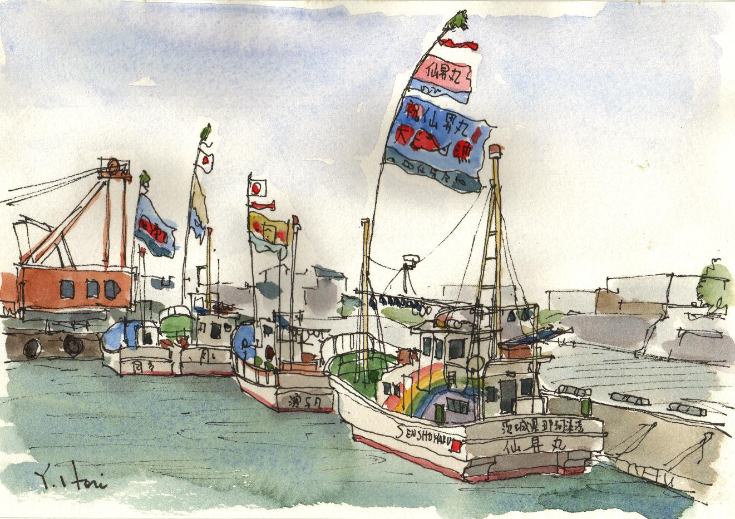 水戸から那珂湊へ足をのばしました。年末には買出しツアーも組まれている大きな魚市場は、年明けからも多くの人出で賑わっていました。港内の漁船はカラフルな大漁旗で飾り立て、新春の雰囲気をたかめていました。