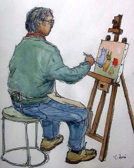 カルチャースクールには老若男女いろんな人が来ています。静物を描く合間に仲間をスケッチしました。Oさんは沖縄の出身でご高齢ですが沖縄の空のような元気な絵を描かれます。