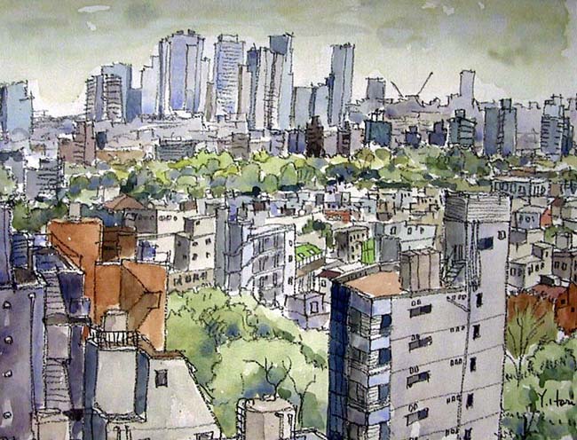 以前、通っていたいた池袋のカルチャースクールからみた新宿高層ビル群のスケッチです。イタリアの城壁都市のようです。