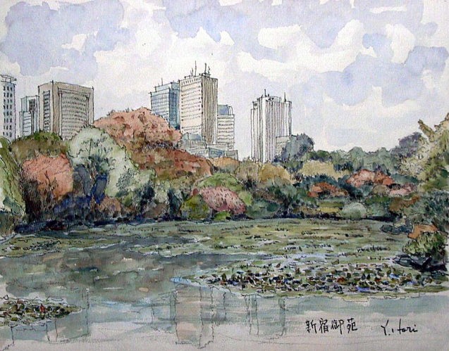 新宿御苑はフランス式庭園、イギリス式庭園と日本庭園がたくみに組み合わされています。プラタナスの並木を両側に4列ずつ配置したフランス式庭園と、大きなユリノキがそびえる芝生広場のイギリス式庭園は見事なものです。水蓮で覆われた中ノ池ごしに副都心の超高層建物群を描きました。