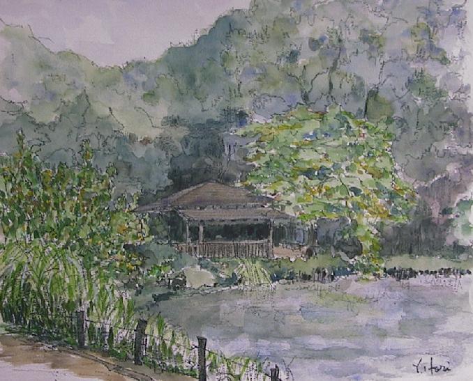 目黒の庭園美術館の隣の国立自然教育園です。都心にありながら武蔵野の豊かな自然を残したオアシスと称されています。まさに蚊取り線香を焚きながら描きました。からすと食用蛙の合唱が耳に残っています。