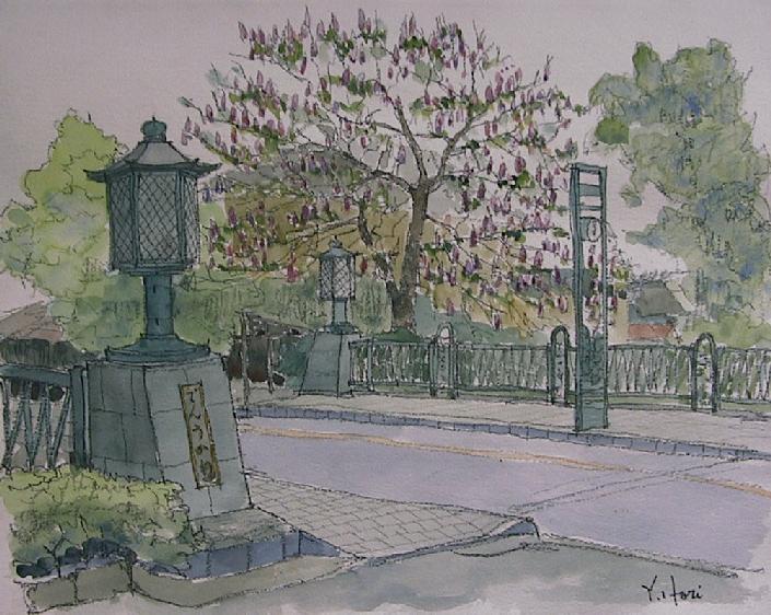 「その日やうやう草加といふ宿にたどり着きにけり」と俳人松尾芭蕉が記したのが江戸時代日光道中第二の宿としてにぎわった草加です。綾瀬川沿い約1.5kmの松並木は江戸時代より「草加松原」「千本松原」と呼ばれ日光街道の名所になっていたそうです。松原より街道脇の桐の花に目が行きスケッチしました。