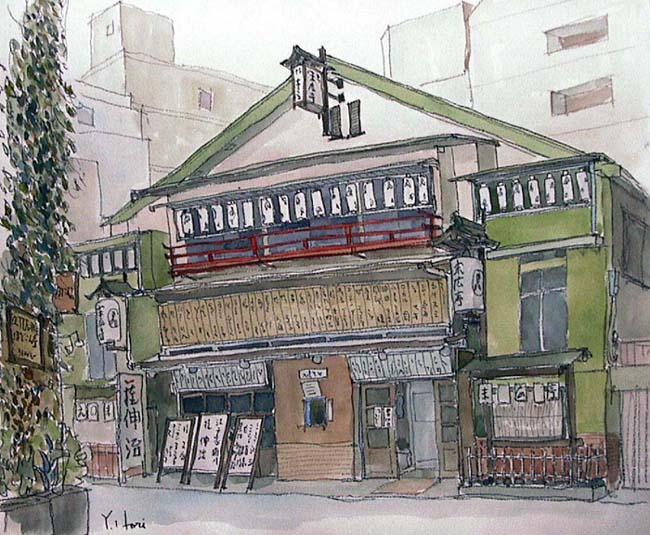 伊勢丹の向かい側の裏の路地裏にたたずむ末廣亭は、都内に4軒しかない落語と色物定席です。唯一の木造建築らしいです。スケッチするちょっと前に、テレビで末広亭の経営が大変で女将さんが苦労しているとのレポートがありました。そのせいかスケッチしていると通りがかりの人から「末広亭は無くなるのですか」と質問されました。