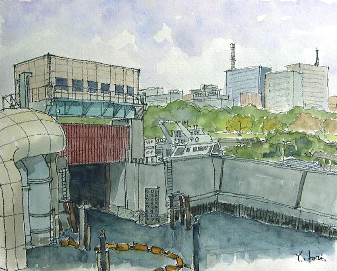 芙蓉のスケッチ会はお台場海浜公園周辺で行われましたが、ゆりかもめ(東京臨海新交通)の「竹芝」で途中下車して描きました。奥に見える緑は浜離宮です。白いFRPのカバーがかかっている変わった水門でした。