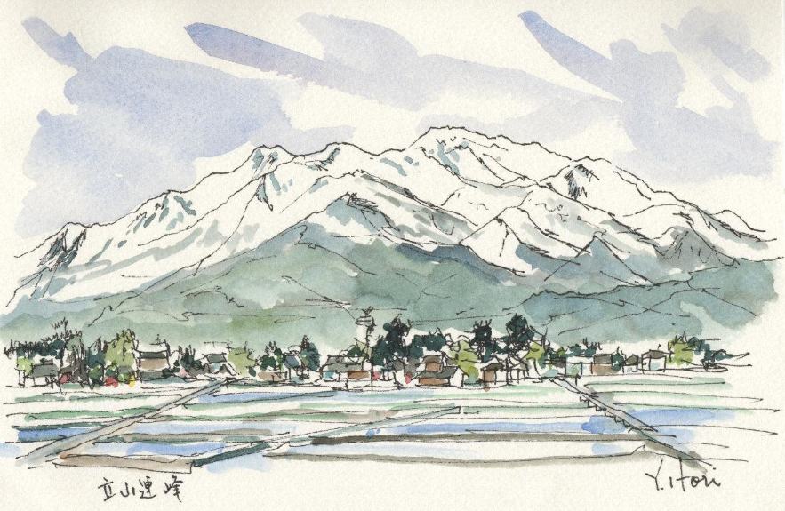 連休初め金沢へ出かけました。北陸自動車道パーキングエリアからの立山連峰の眺望です。左手には白馬連山が鋸の歯のように並んでおり圧巻でした。丁度、麓の田には田植え前の水がはられており、水面に映る雪山は限られた時期だけの貴重な風景でした。