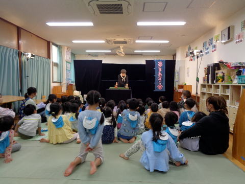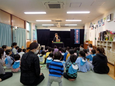 「きつねとたぬきのばけくらべ」も、お話しの古典です。きつねくんとたぬきさんのばかしあいに、みんなドキドキ、ワイワイ。あっという間の45分でした。